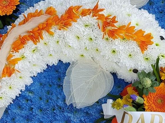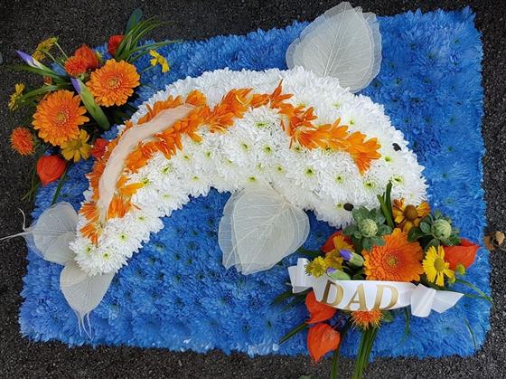 Orange and white Koi Carp swimming, with flower sprays and optional name sash. We can alter colours to suit you. This design sits on a base 2ft (62cm) x 16 inches (41cm) and fish is shaped to sit above the base , so not flat