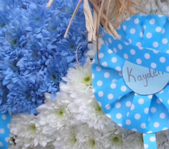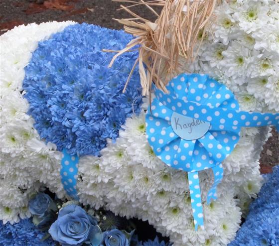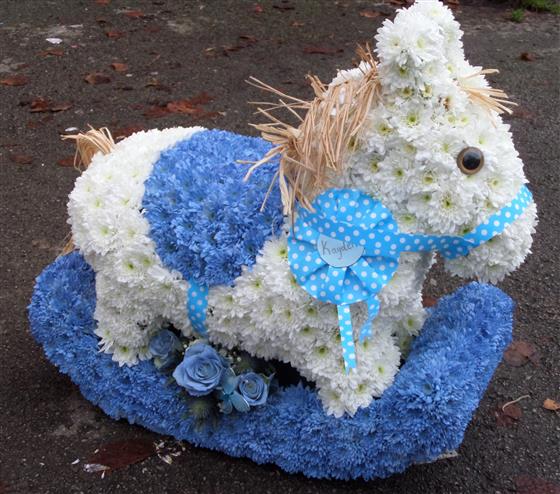 3D Rocking Horse, also available in pink and white, stands around 40cm to the head. Names sash/rosette is optional. Ribbon and flower spray may change depending upon seasonal availability. 2d design, which would sit flat to the floor is available upon request please call for details 0121 366 7226