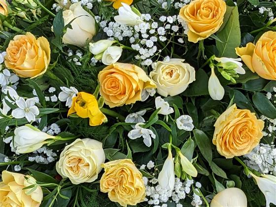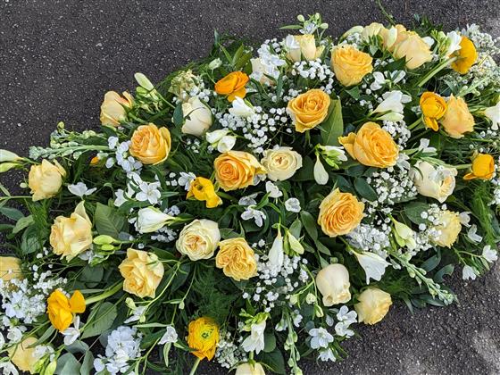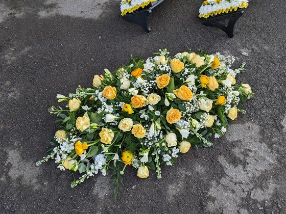 Seasonal flowers to compliment your chosen colour rose which are plentiful in this casket spray. Give us an idea of your colour choice below or give us a call 0121 366 7226 to discuss your requirements