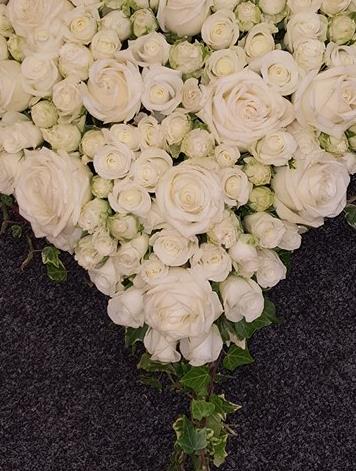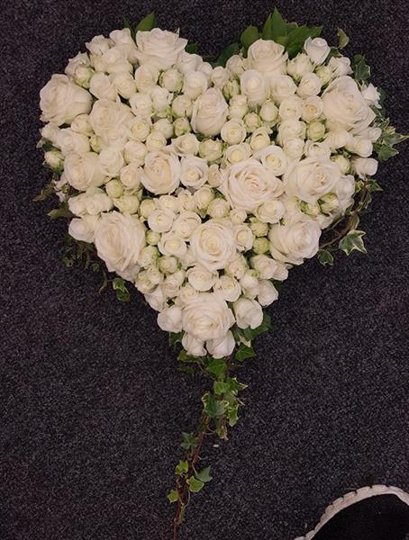 Heart shaped tribute made entirely from spray roses and single roses framed with ivy trails. Other colour roses are available and you can give us an idea of your colour in the box below but this does not include dyed roses such as blue or rainbow roses. Or you can call 0121 366 7226 or pop in store and have a chat with us to discuss your requirements.