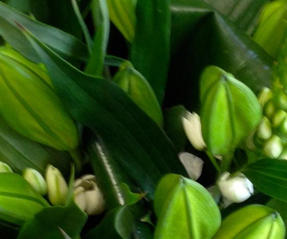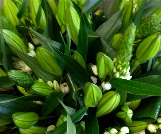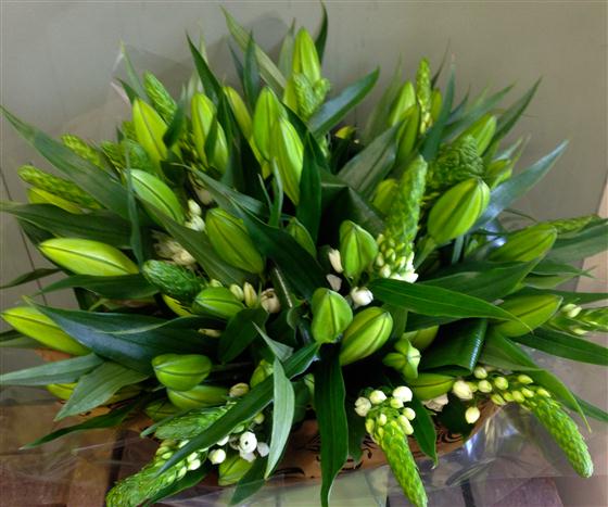 An opulent display of scented, white oriental lilies and complimentary flowers such as stars of Bethlehem ( shown in the picture) presented as an aqua packed bouquet.