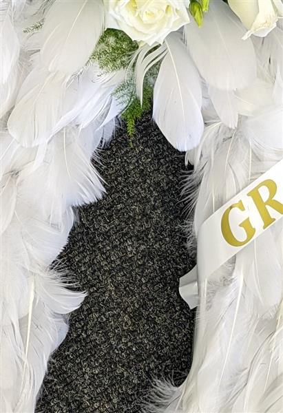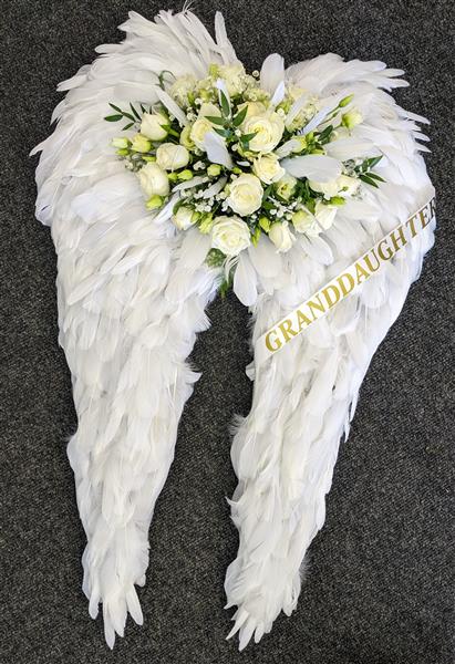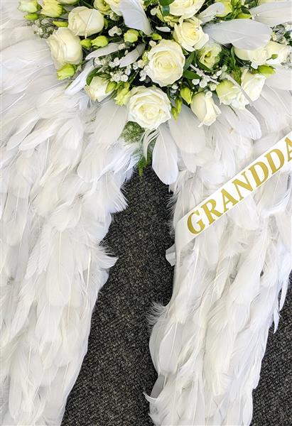 Angel Wings, based in white feathers with a rose spray in colours of your choice across the centre. Name sash is optional. Length is 3ft (90cm) Call to discuss your requirements 0121 366 7226