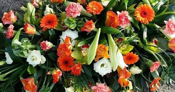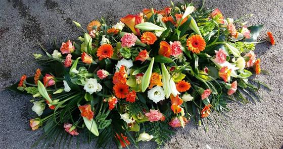 A vibrant family tribute of deep oranges and rusts with a hint of white , a combination of mixed seasonal flowers which our florist will choose for you to give you a perfect arrangement fitting for your loved one. Standard price is for 3ft (91 cm)