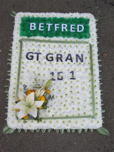 A betting slip is a very personal tribute, we can copy details from a particular slip and customise it with your chosen words or jargon. Other colours and company logo's are available. Small is 1x2ft, large 2x3ft
