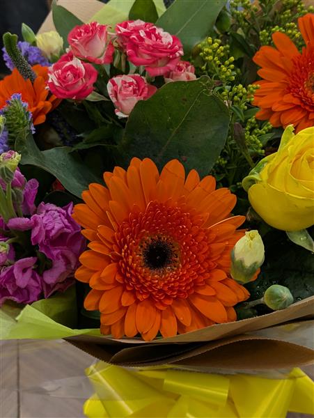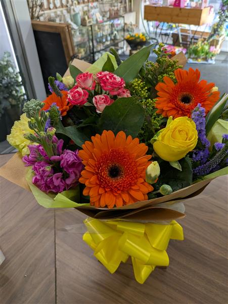 Seasonal flowers and foliage in bright and Bold colours for an eye catching bouquet. Colours and flowers may vary but you can be certain it will be an eye catching bouquet, it's one of our favorites