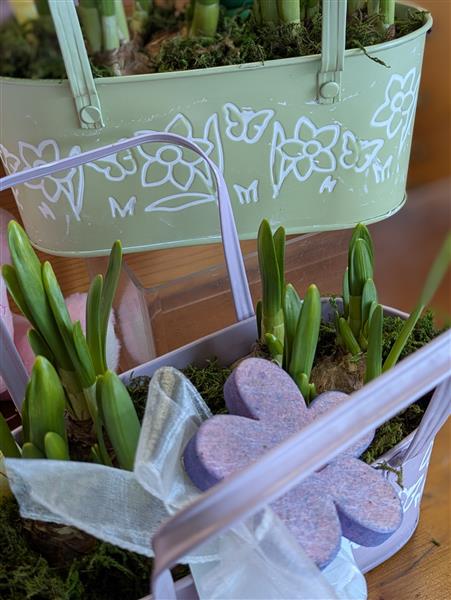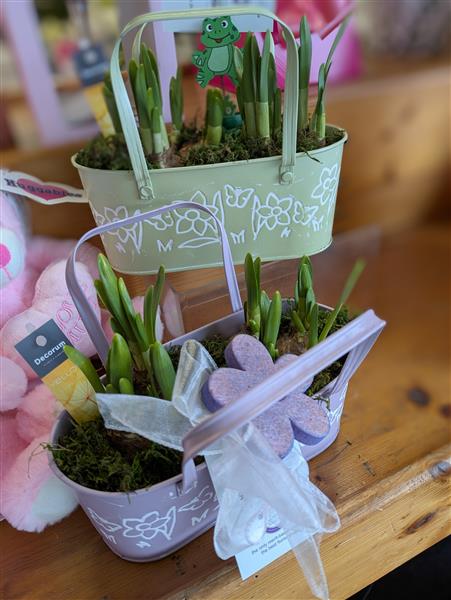 Mini daffodil baskets, various colours available in baskets so may vary from picture. Lovely little gift, bulbs can go in the garden. Suitable for outside.