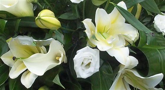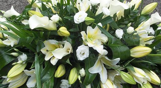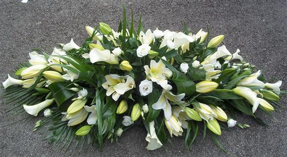 Casket spray displayed is a standard size of 3ft. Arrangement consists mainly of roses, Oriental and Calla lilies in white,ivory colours with seasonal green foliage and a few seasonal flowers to accompany. This spray can be made in other colour combinations although you should be aware that Calla lilies are available in limited colours and as much notice as possible should be given to allow us to get the Oriental lilies open so they look at there very best.We can not guarantee how open the oriental lilies will be at any given time during the year, we will do our best to have them open for you.