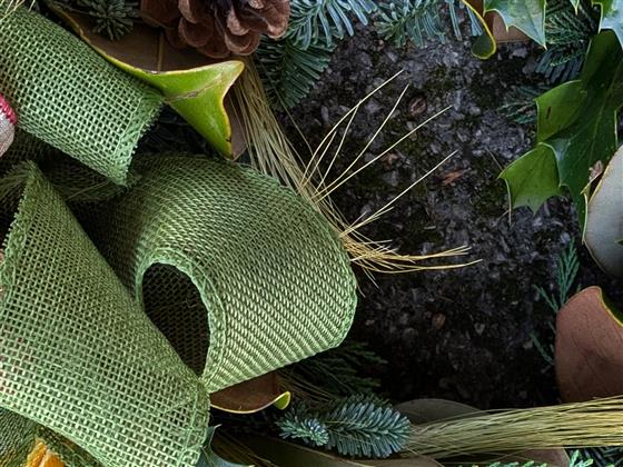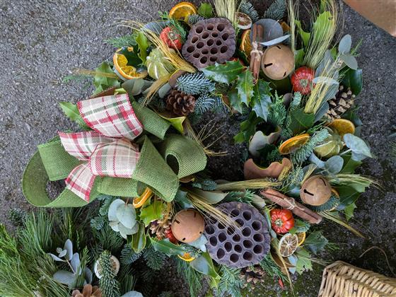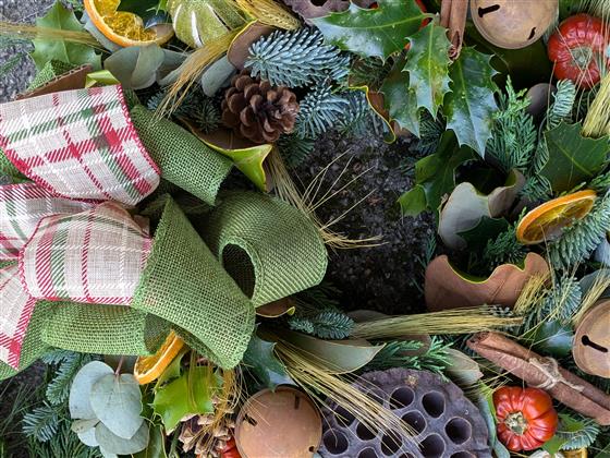Christmas door decorations made from fresh spruce, holly, pine and other winter foliage with various decorations: natural dried fruit slices and cinnamon sticks or baubles and sparkles ! Made to order or let us choose for you