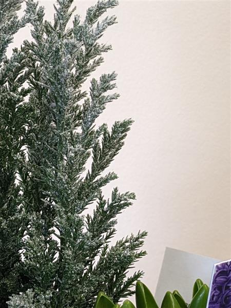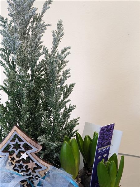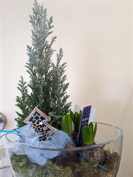 Small snowy Christmas tree with hyacinth bulbs in a glass vase. Hyacinths will vary in colour depending on stock