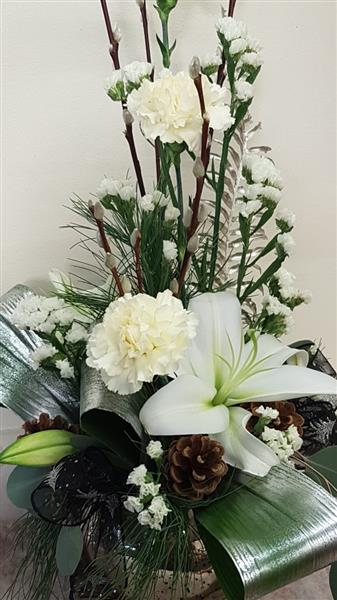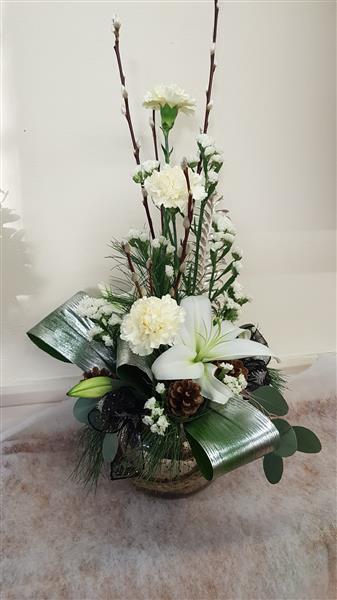 Gorgeous front facing arrangement with white oriental, perfumed lilies with foliage and other seasonal flowers and decoration in a champagne coloured ceramic bowl. Lilies may be in tight bud when delivered. You can call if you wish to add more colour 0121 366 7226. Available for delivery in December