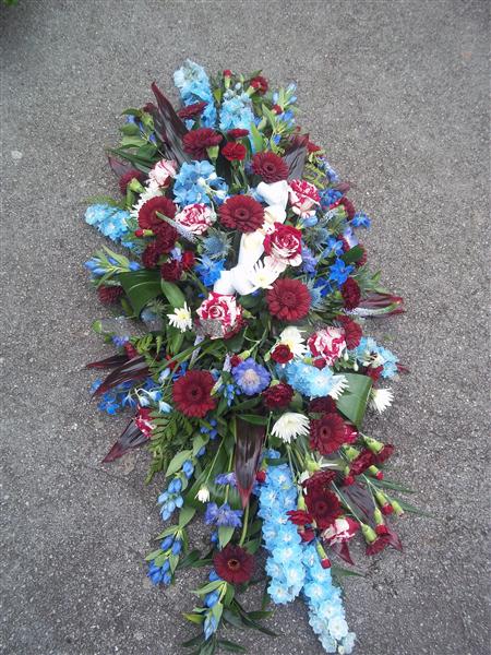 Casket spray of mixed seasonal flowers, picture shows a 4ft (122cm) spray in claret, blue and white colours. Flowers will vary depending on availability during the year