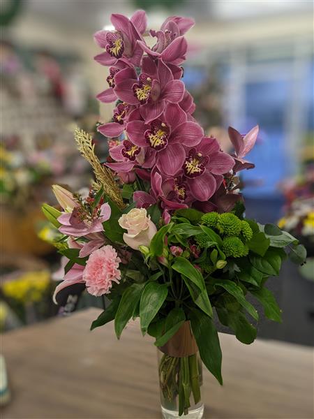 Single stem of large headed Cymbidium orchids with accompanying foliage and seasonal flowers and decoration in a glass vase. Colour of orchid will vary from picture. Available for delivery in December