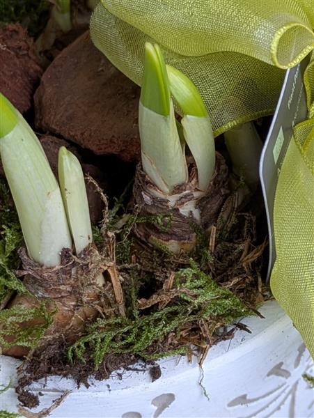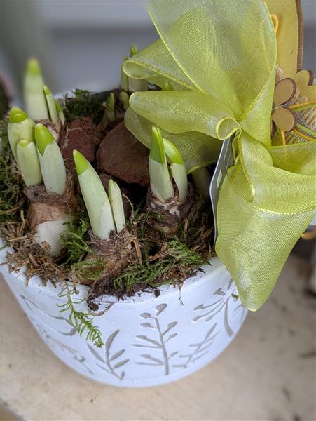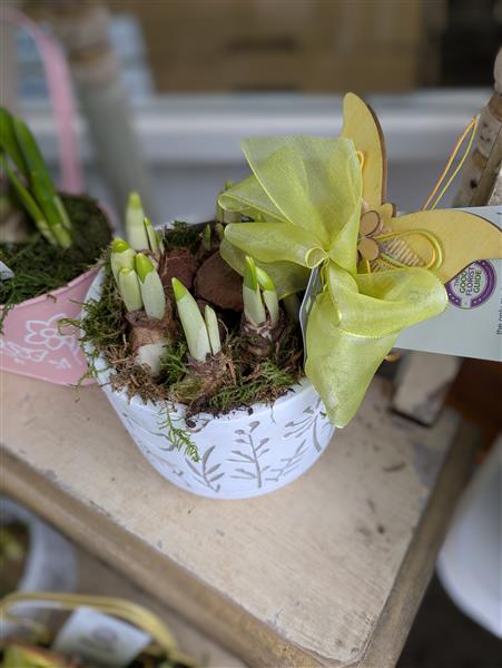 Pretty pot of mini daffodils, ideal little gift. Suitable for outside as well as indoors. Easy to look after. Decorated with a lemon bow and butterfly detail.