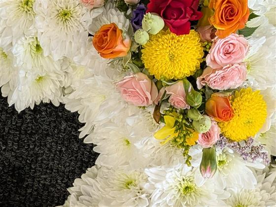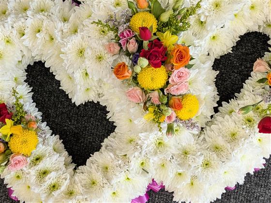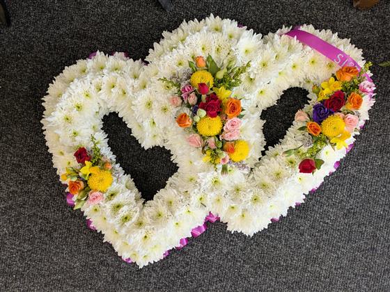 Double heart shaped tribute, ribbon sash is additional. Colours can be changed to suit you,please let us know in the box below and we can change the ribbon and spray colours to suit you. Or give us a call 0121 366 7226 to discuss.