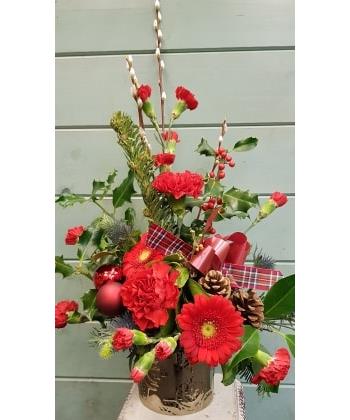 Christmas arrangement with seasonal winter foliage and flowers in a cute ceramic pot. Available for delivery in December