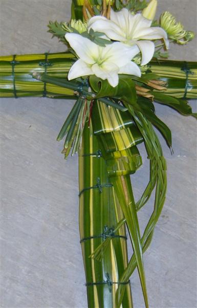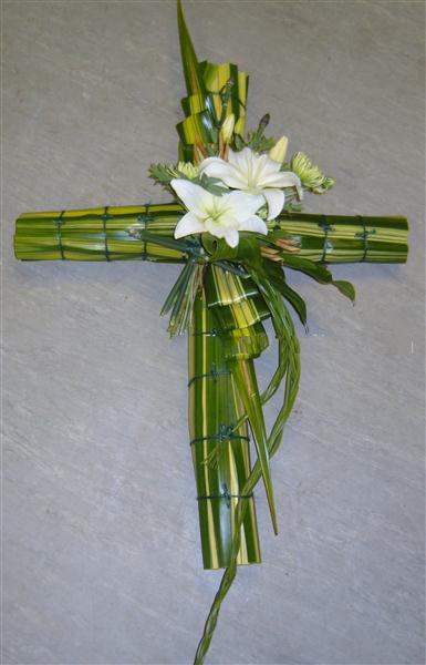The pictures shows a standard size 2 ft (61cm) cross tribute with a base of foliage, this can vary throughout the year depending on seasonal foliage availability. With a floral spray in the centre and made on a base of straw this tribute is totally bio degradable. Flower colours can be changed according to your preferences