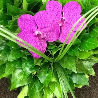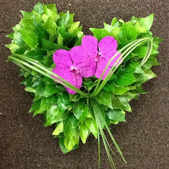 Foliage based heart tribute with few single orchid heads or roses in the centre. Flowers in centre may be orchids or roses depending upon availability. Colour of orchids/rose can be altered or alternative flowers can be added please indicate in the box below. Standard size is a 10 inch base