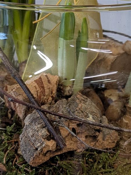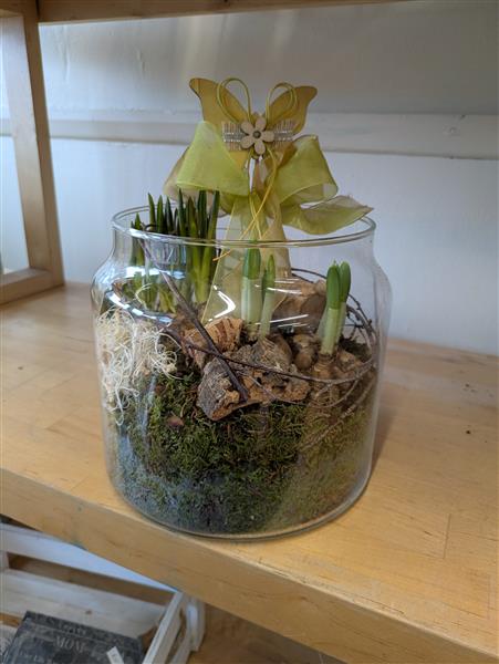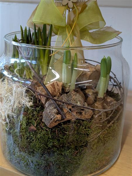 Beautiful glass vase of planted bulbs, includes miniature daffodils and Muscari (Grape Hyacinths) so will flower in yellow and blue colours. Really lovely, low maintenance gift ideal for indoors, in a warm room. Bulbs could be planted in a garden afterwards to flower every year and the glass vase can be re used, re cycled....we could fill it with flowers maybe next time you buy them a gift !