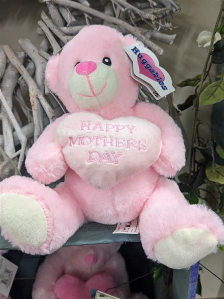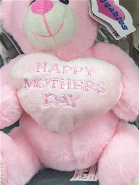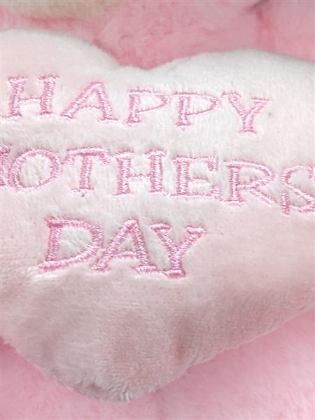 Pink cuddly bear holding a heart reading happy mother's day