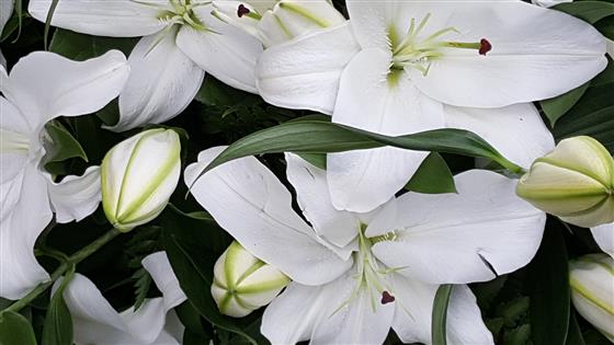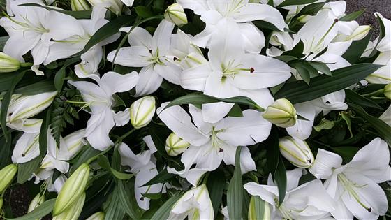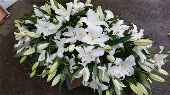 Casket spray, 4ft long (184 cm) of white oriental lilies and seasonal foliage. Please allow as much notice as possible for us to give the flowers time to bloom