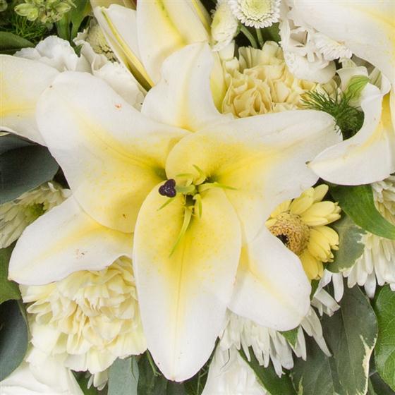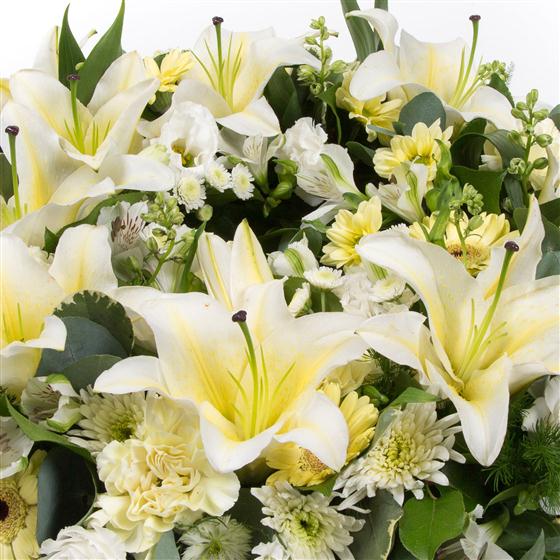 Subtle lemons and creams incorporating lilies and other seasonal flowers combine to create this elegant wreath. Standard price is 10" (31cm)