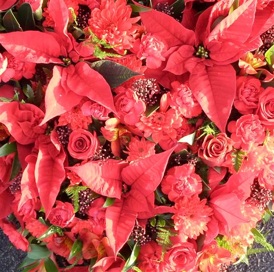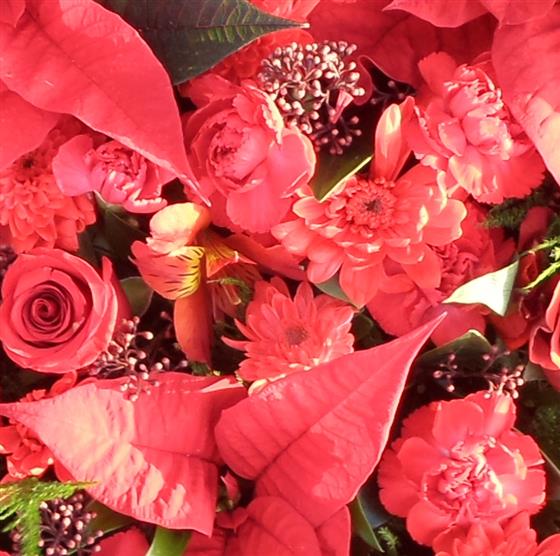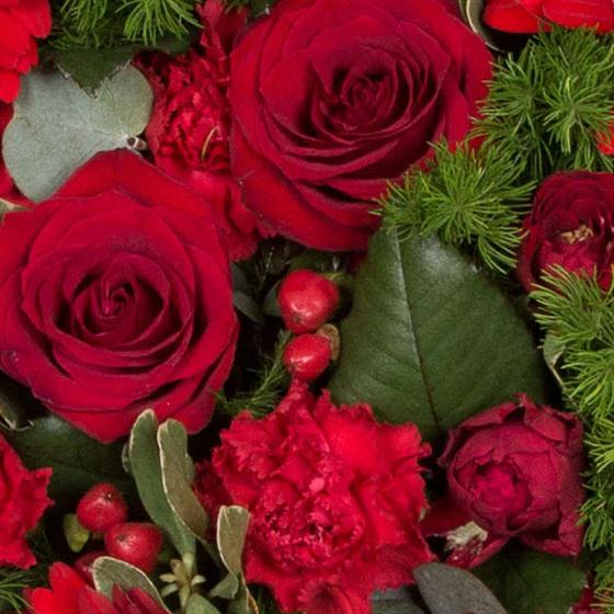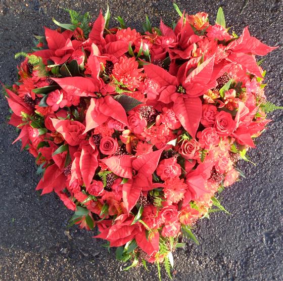 This striking red heart is created using a combination of seasonal foliage, hypericum berries and all red blooms. Flowers will vary due to seasonal availability