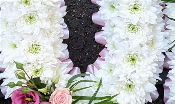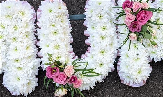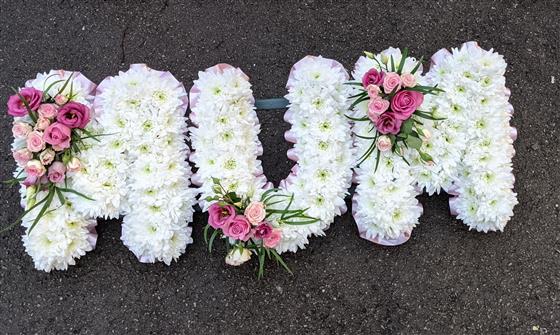 Picture shows Mum letters massed in white chrysanthemums with pastel pink ribbon edge and sprays which include roses and other seasonal flowers. If you wish to have a different colour ribbon and floral sprays please let us know in the box below or give us a call