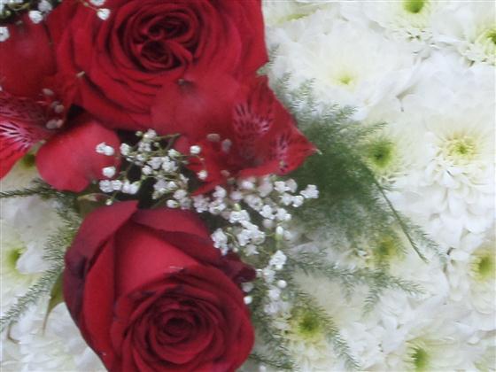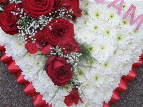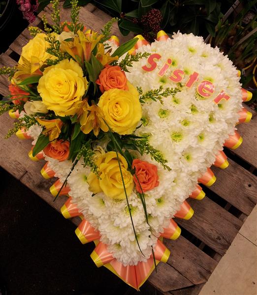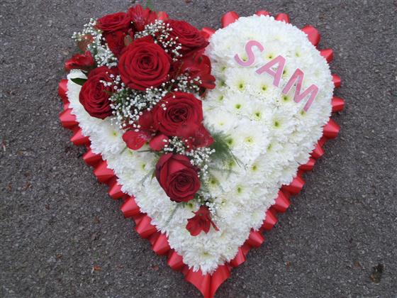 A massed heart shaped tribute available in a variety of colours with roses and other seasonal flowers in the spray. Available with a ribbon edge and a floral spray in your colour choice, just let us know in the box below. Or give us a call to discuss your personal requirements we can add a name of up to 6 letters. Flowers base will remain white.