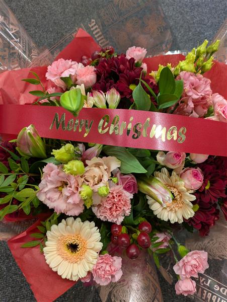 Seasonal flowers arranged in water, using pink and red shades with seasonal foliage.