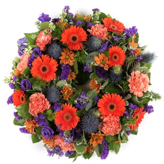 This traditional wreath combines thistles, statice, deep purple lisianthus, carnations and mini gerberas to create a masculine tribute.Available in other colours. Some flowers may be substituted due to seasonal availability.