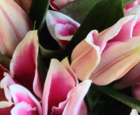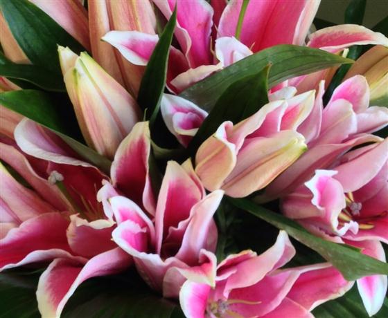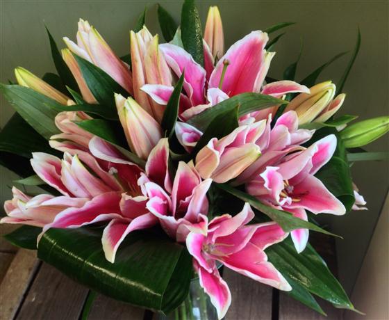 A beautiful, highly perfumed bouquet of pink oriental lilies and seasonal foliages.