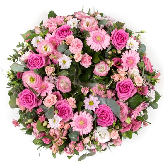 Our Soft Pink Eternal Ring Wreath is a graceful and feminine tribute, designed with seasonal flowers in gentle shades of soft pink and wispy foliage for a light, elegant finish.