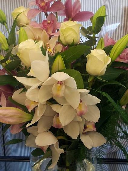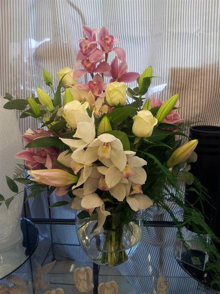 Stylish orchids, lillies and white roses in an vase arrangement.