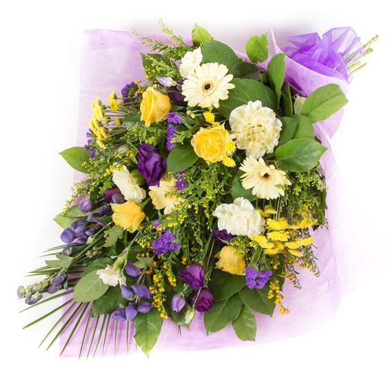 A traditional sheaf of golds and purples including roses, lisianthus, mini gerberas and solidaster depending upon availability other seasonal flowers may be used.