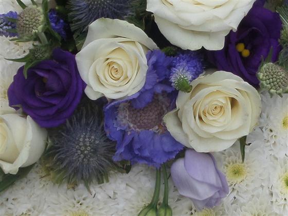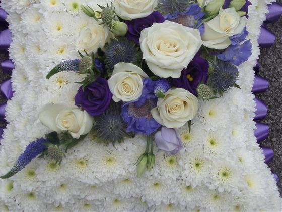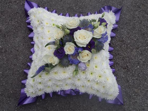Traditional based cushion tribute with purple ribbon edging and a white chrysanthemum base; the spray consists of white roses with other seasonal purple and white flowers. A name on a ribbon sash can be added if you wish. Other colours are also available please give us a call 0121 366 7226 to discuss your requirements. Standard size is on a 15 inch (38cm) square base