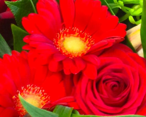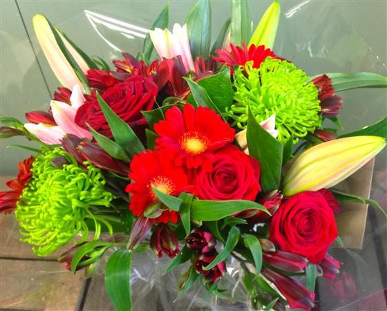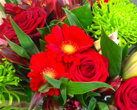 Ruby red gerberas, roses and alstromeria accented with scented lilies and vibrant lime green chrysanthemums. Available for delivery in December