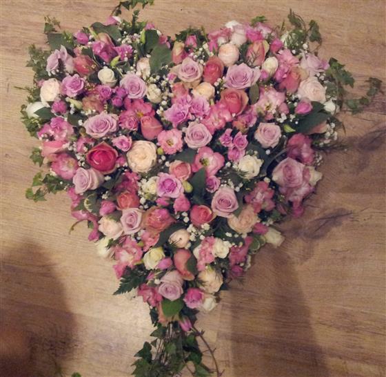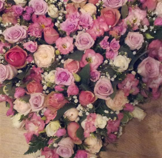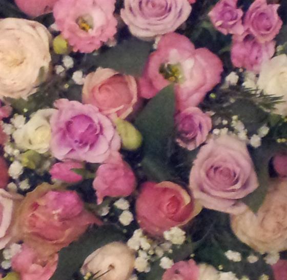 A collection of roses in varying shades and sizes, interspersed with lisianthus, Gypsophylia and other seasonal flowers and foliage. Other colours are available.Standard size 12" (31cm) Please indicate if you require a different colour rose/flowers in the box below but be aware that blue or rainbow roses which are dyed are not available for this design