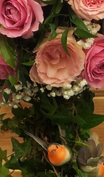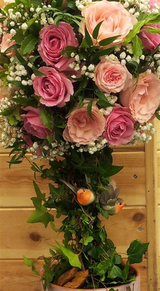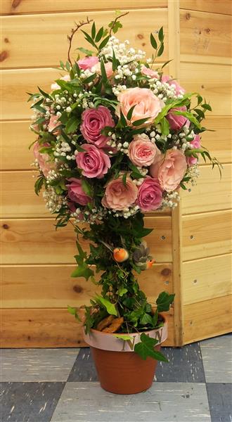 Rose tree design in a terracotta pot, little birds are optional. Using a variety of roses, picture shows pink shades, with seasonal foliage and Gypsophylia the tree stands approx 2ft (62cm) tall.