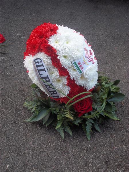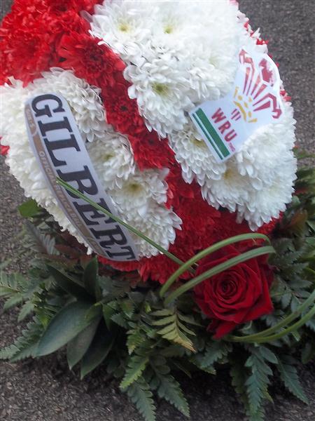 Rugby ball tribute, the picture shows the Welsh Rugby Colours and emblem but any alternative can be made. The size is slightly bigger than an actual rugby ball, larger designs can be made upon request and priced accordingly feel free to give us a call