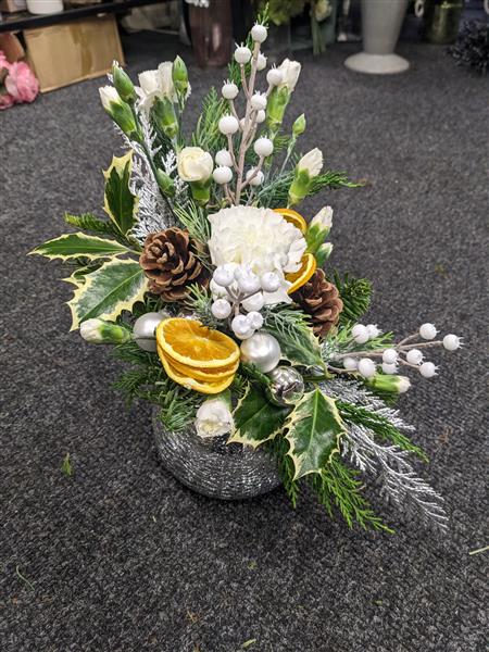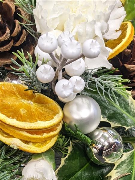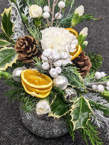 Small arrangement in a glass candle vase with a handle, contains seasonal foliage with sparkle and artificial berries with fresh white spray carnations and other white seasonal flowers. Available for delivery in December