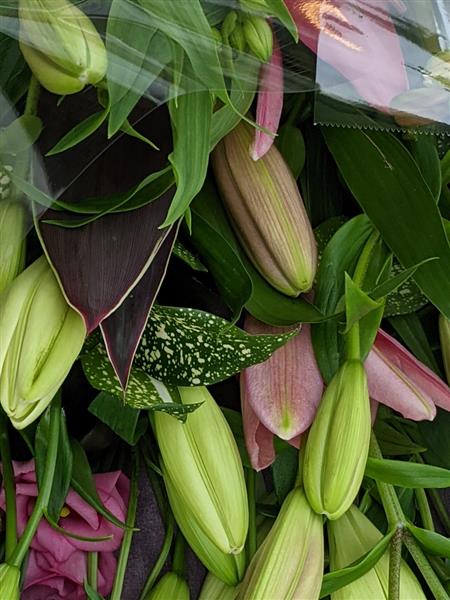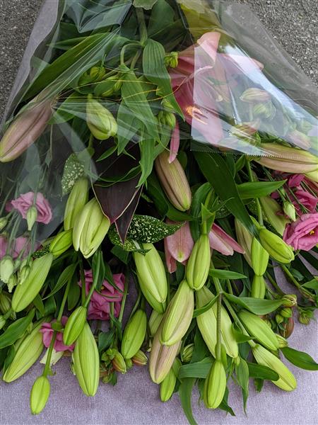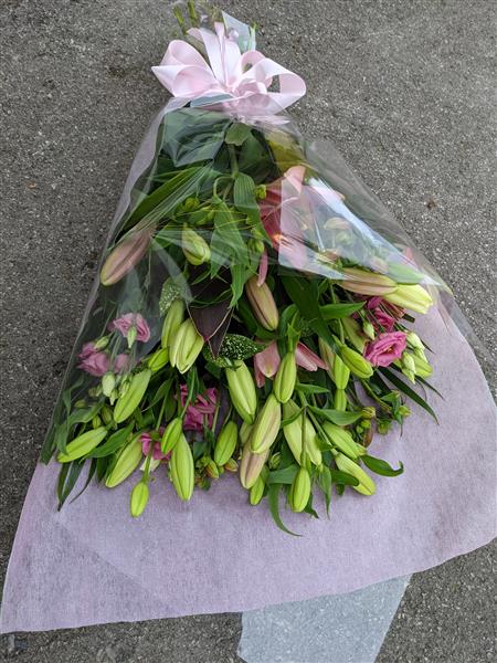 Minimum of 6 stems of Asiatic lilies, assorted colours will vary depending upon stock levels. Wrapped simply in cellophane and seasonal foliage and other seasonal filler flowers. Picture shows pink and cream lilies with Lisianthus and Alstromeria to accompany them.