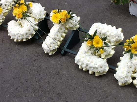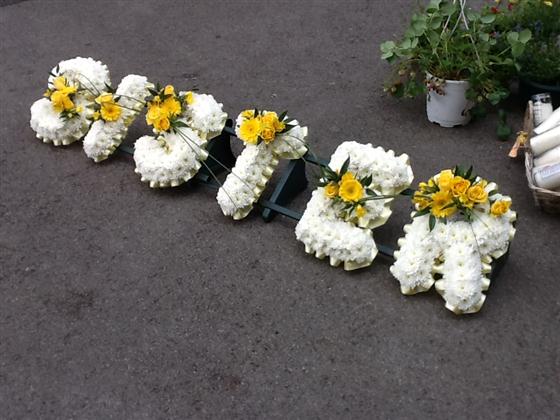 Sister tribute based with white Chrysanthemums with seasonal flower sprays on each letter. Please let us know your colour choice for the ribbon and sprays in the box below or give us a call.