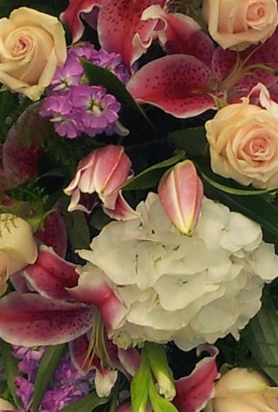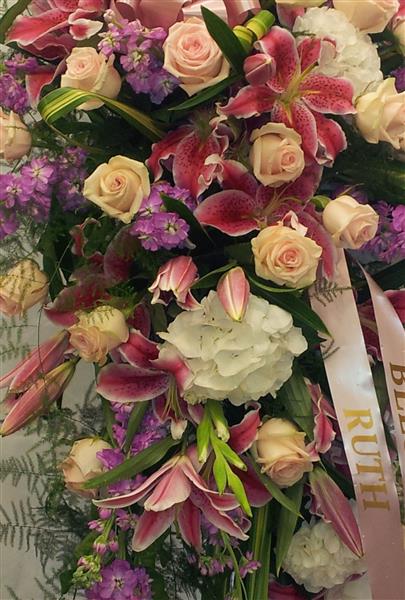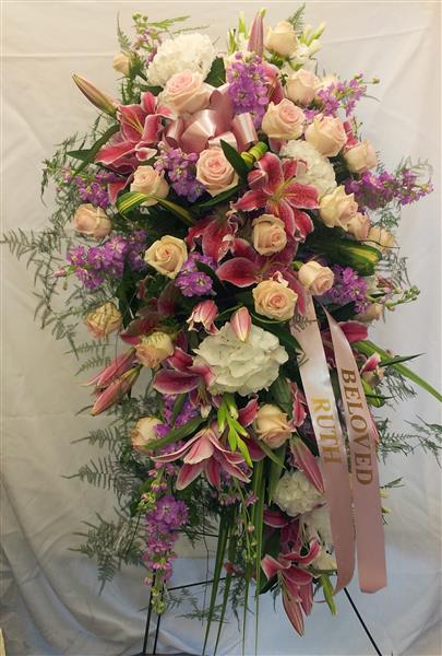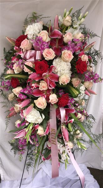 This Spray of flowers, picture shows a presentation of large headed roses with stocks, Hydrangeas and trailing fern and other choice flowers, is made to be displayed on an easel. Height of the easel varies and the picture shows the deluxe design which stands just above 4 foot (120cm) tall. Standard design would use a mixture of seasonal flowers to include roses at 3ft (90cm), medium features a bigger, fuller arrangement on a 3 foot (90cm) easel. Please call if you have any special flower or colour requirements which are not shown. Ribbons are optional.