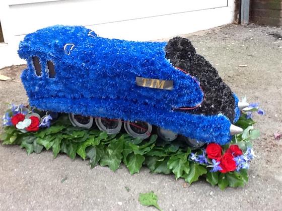3D Design , in this case to replicate The Mallard Steam Train but other types can be copied. For an idea of size this design sits on a base which is 3ft (90cm) x 16 inches (40cm) and the train itself stands around 18 inches (45cm) high and is almost the length of the base with rose sprays in each corner. Please contact us with your requirements 0121 366 7226