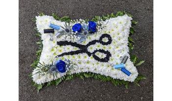 Pillow tribute with a silhouette of a pair of tailors scissors in the centre, thimbles and cottons detail can also added. Please give us a call to discuss alternative requirements.