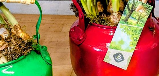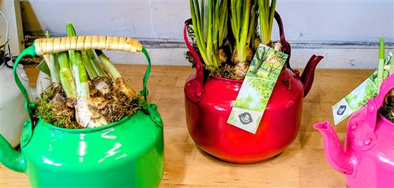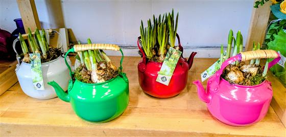 Little teapots in various colours; red, green, pink & white with Muscari (Grape hyacinth's) planted inside which have cute little blue flowers/bells. Really funky little gifts, ideal for inside or outside, easy to care for and maintain.
