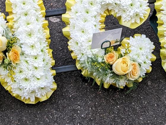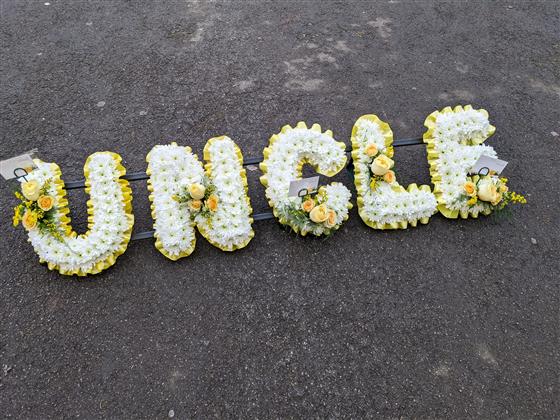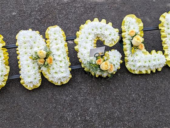 Ribbon edge colour and sprays can be changed to suit you, let us know in the box below. Letter base is white chrysanthemums