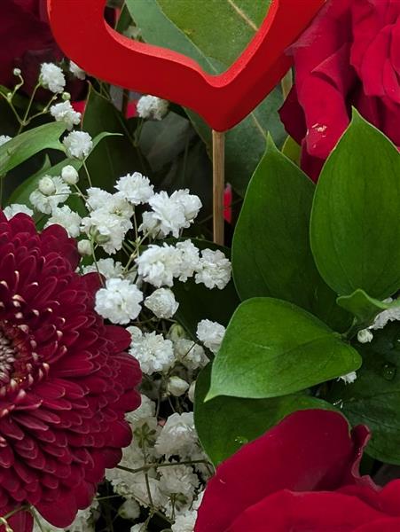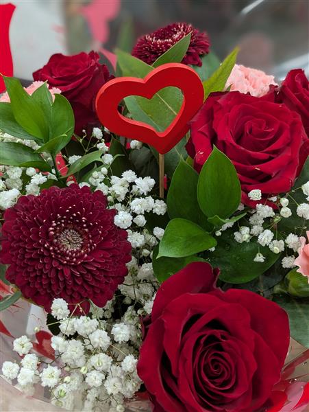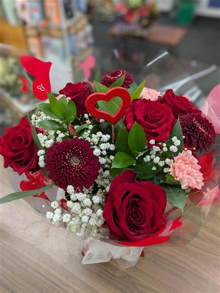 Hand tied bouquet presented in a box, in water. Comprises of five best red roses, either Freedom or Explorer with seasonal foliage, gypsophila with 3 x carnations and 3 x mini gerbera. Lovely gift for your Valentine xx